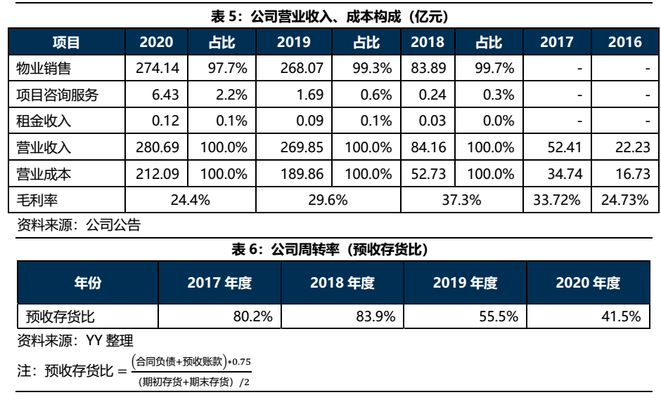 公司營業收入主要包括物業銷售、項目咨詢服務以及租金收入,2020年度物業銷售收入占營收比重達97.7%,是公司最主要的收入來源。可以看到2016年以來公司營收規模不斷擴大,但2020年增速下降明顯,同時2018年以來毛利率水平與周轉率持續下降。