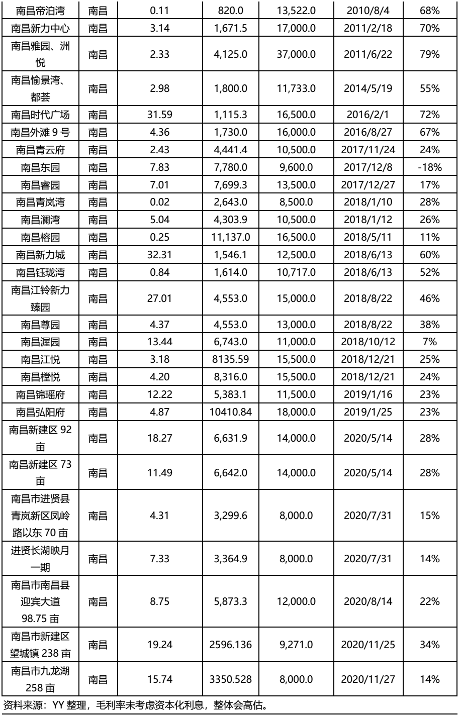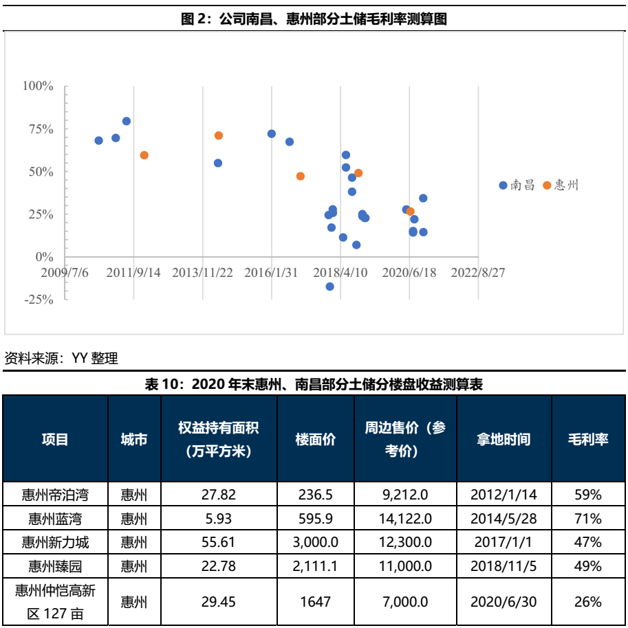對公司核心城市南昌、惠州的土地儲備按3500元建安成本進行毛利率測算,可得南昌與惠州土儲測算毛利率分別為37%與46.6%,處于較高水平;而從拿地時間上看,一般拿地越早的項目測算毛利率越高(未考慮資本化利息,其實疊加高融資成本毛利率會顯著侵蝕)。