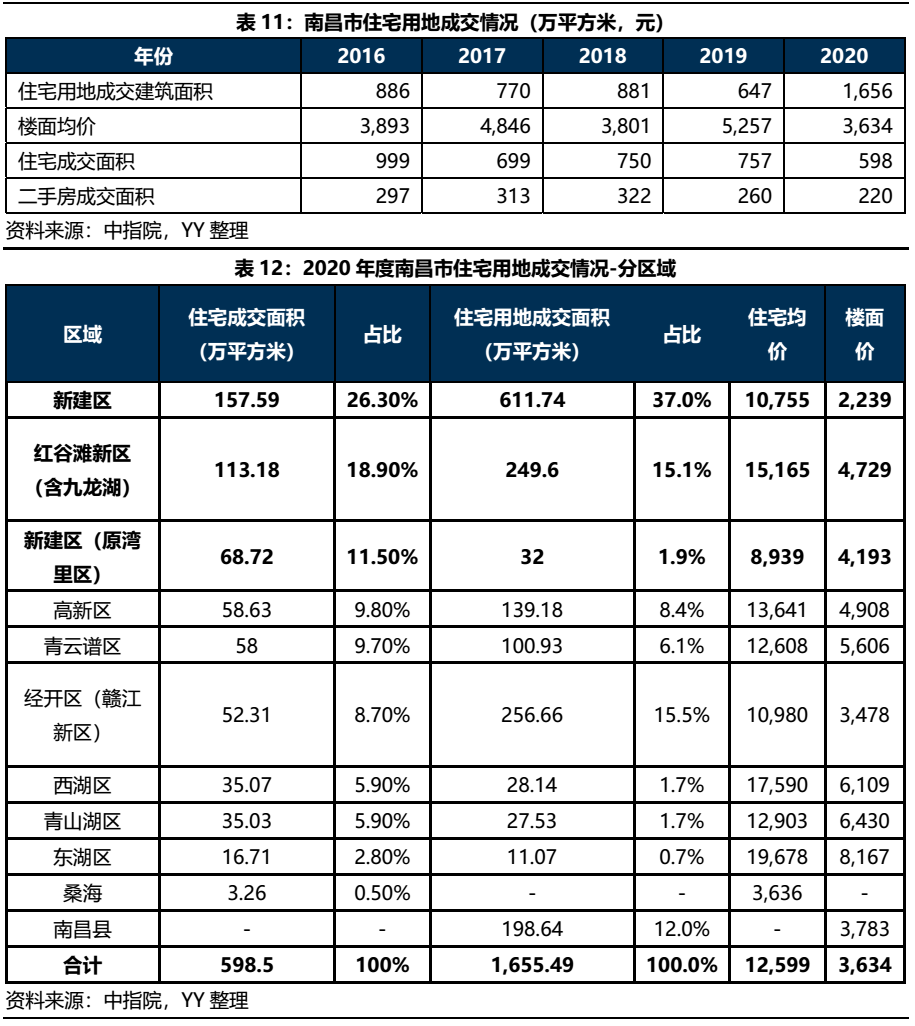 從住宅用地、商品房成交情況上看,2020年度南昌市住宅用地成交建面達1,656萬平方米,同比增長156%,樓面均價以及商品住宅成交面積有所下降,二手房成交也較為低迷。值得注意的是2020年度住宅用地、商品房的成交主要分布在南昌市新城區新建區、紅谷灘新區和外圍地區的南昌縣等,以東湖區、西湖區、青山湖區、青云譜區為主的老城區分布較少。