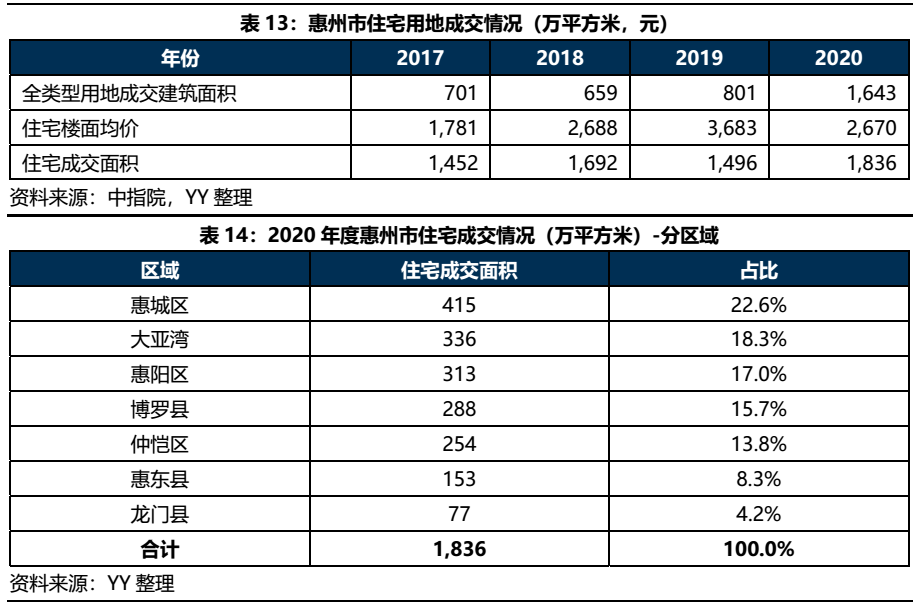 從住宅用地、商品房成交情況上看,2020年惠州市全類型土地成交面積達1,643萬平方米,同比增長105%,相對應的住宅成交面積達1,836萬平方米,2017-2020年惠州市場整體處于去庫存的狀態。其中作為主城區的惠城區,以及毗鄰深圳的大亞灣和惠陽區住宅成交面積排名靠前。