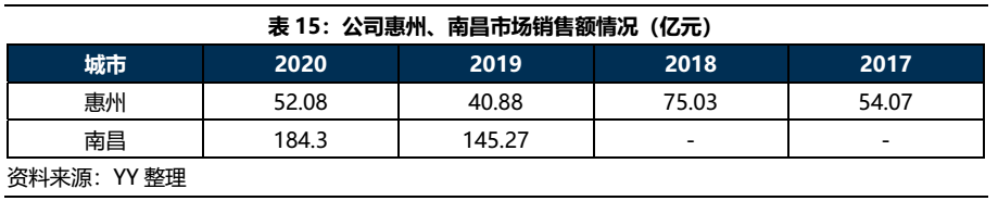 值得注意的是,惠州市作為公司內部僅次于南昌的第二核心城市,2019年公司無惠州拿地項目。也就是說,除去2020年公司在惠州拿的108.5萬方權益建面的土地,公司目前在惠州的314.2萬方權益土儲是在2018年及之前形成的,說明公司在惠州的項目去化不甚理想。而這一點從南昌、惠州市場銷售數據中也能看出端倪,作為土儲規模相當、銷售均價相差不大的兩個城市,南昌的銷售貢獻明顯超過惠州。