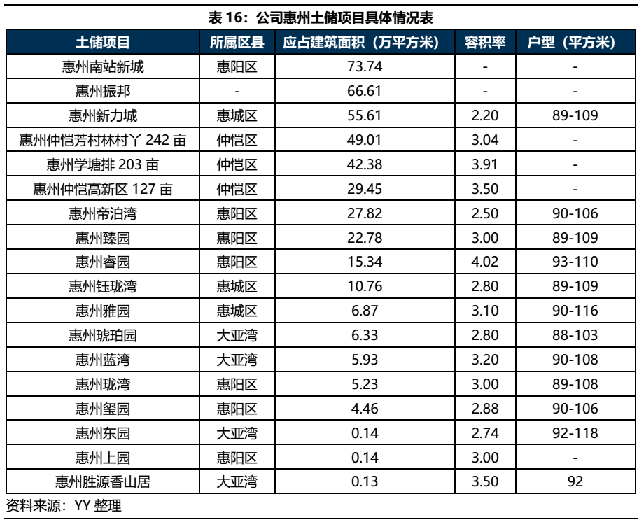公司在惠州的項目整體容積率偏高,大多在2.8以上,且戶型面積主要在88-110平方米之間,樓盤品牌主要為“園”和“灣”,沒有高端品牌“悅”,(公司品牌“園”、“灣”、“悅”分別對應剛需、改善、高端住房需求)。可見公司在惠州的定位主要傾向于剛需群體。