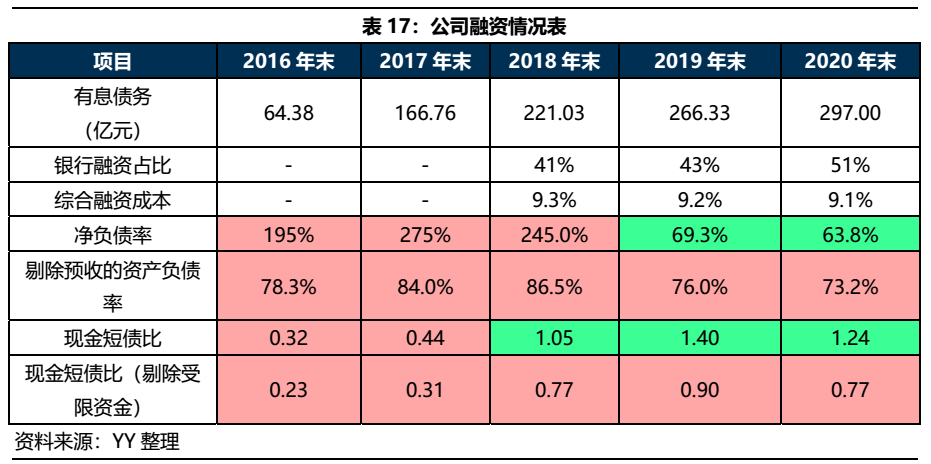 公司整體杠桿水平較高。截至2020年末,公司有息債務規模達297億元。按債務期限看,其中短期有息債務占比47.5%,短期有一定償債壓力;按債務結構看,非標融資占比達26%,比例非常高。公司近年來銀行融資比例雖有所提高,但2020年綜合融資成本為9.1%,近年來一直處于較高水平,高杠桿高成本,很容易放大風險。