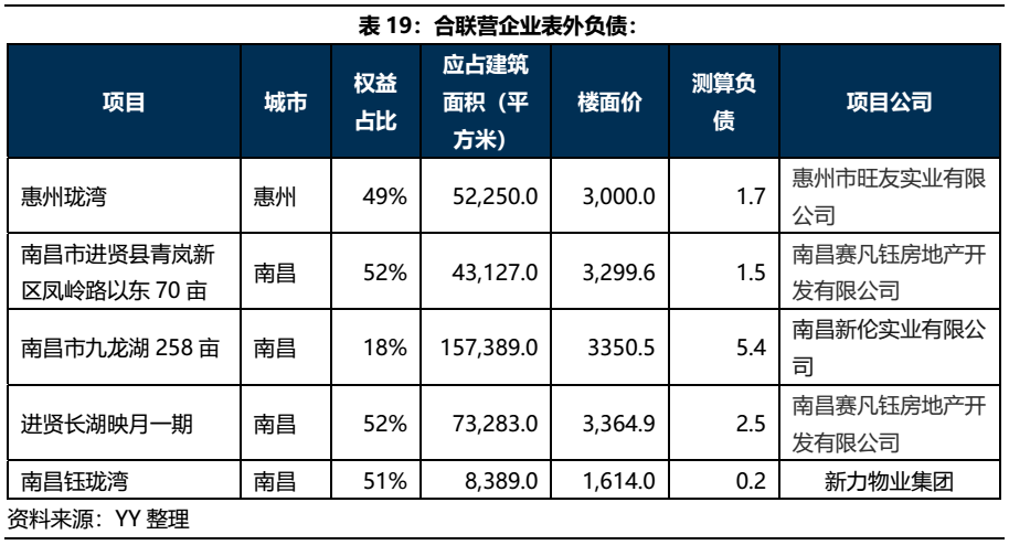 合聯營公司表外負債:按照“測算負債=建筑面積*(樓面價+3500元建安成本)*0.5”的方法來測算可疑合聯營公司的表外負債,測算歸屬于公司的規模為11.3億元。
