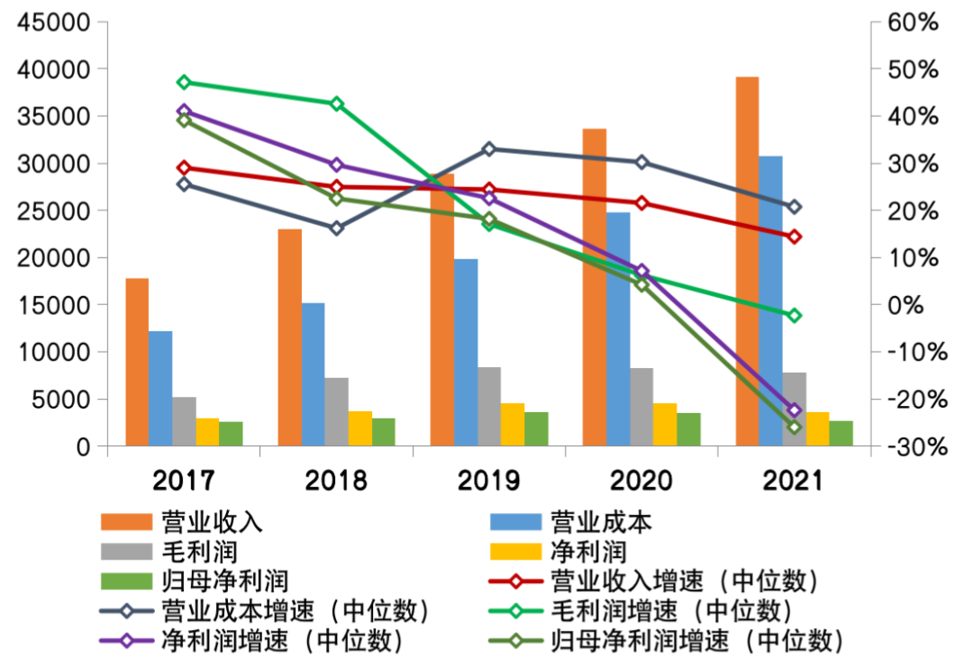 在營收和營業成本增速不匹配的擠壓下,行業利潤增速放緩,直至出現負增長。