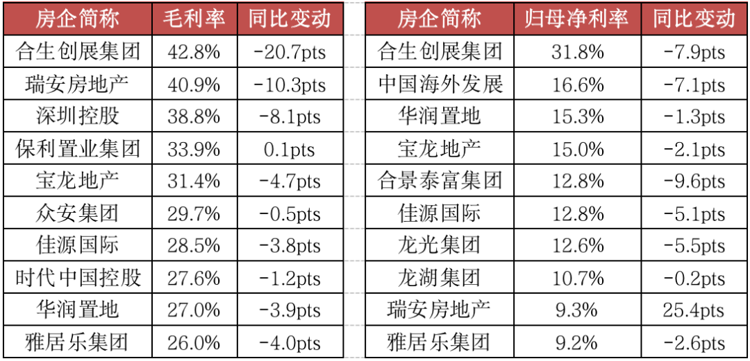 表:2021年典型房企毛利率及歸母凈利率TOP10