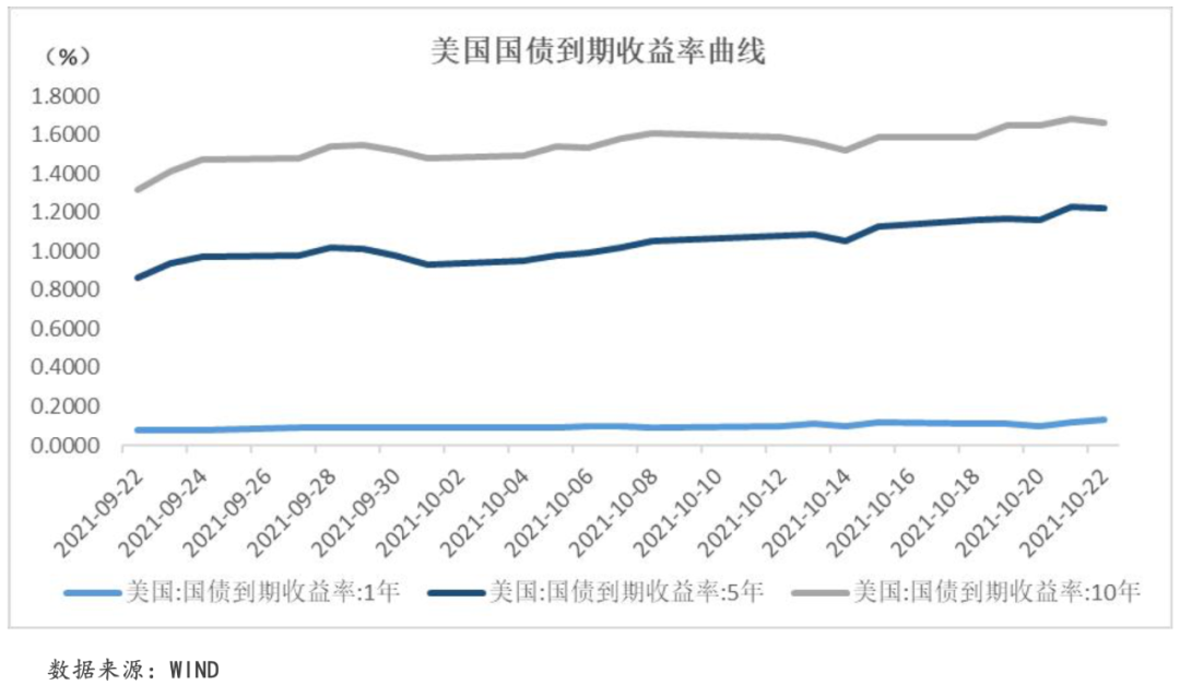 本周,美國公布數(shù)據(jù)顯示美國高通脹仍將持續(xù)運(yùn)行,各期限美債收益率紛紛上漲。具體來看,本周1年期、5年期和10年期美國國債平均收益率較上周上漲0.65個(gè)BP、10.05個(gè)BP和8.10個(gè)BP至0.11%、1.19%和1.65%。