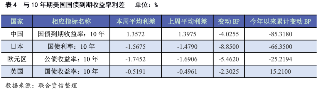 本周各期限中美國債平均收益率利差走勢(shì)不一,1年期中美國債平均收益率利差分別較上周走擴(kuò)2.20個(gè)BP至2.25%;5年期和10年期中美國債平均收益率利差分別較上周收窄4.26個(gè)和4.03個(gè)BP至1.68%和1.36%。本周1年期、5年期和10年期日美國債平均收益率利差分別較上周走擴(kuò)0.63個(gè)、10.20個(gè)和8.85個(gè)BP至-0.23%、-1.27%和-1.57%。本周1年期歐元區(qū)公債與相應(yīng)期限美債平均收益率利差分別較上周收窄1.80個(gè)BP至-0.82%;5年期和10年期歐元區(qū)公債與相應(yīng)期限美債平均收益率利差分別較上周走擴(kuò)3.77個(gè)和5.46個(gè)BP至-1.63%和-1.75%。本周5年期英美國債平均收益率利差分別較上周收窄2.54個(gè)BP至-0.33%;10年英美國債平均收益率利差分別較上周走擴(kuò)2.30個(gè)BP至-0.52%。