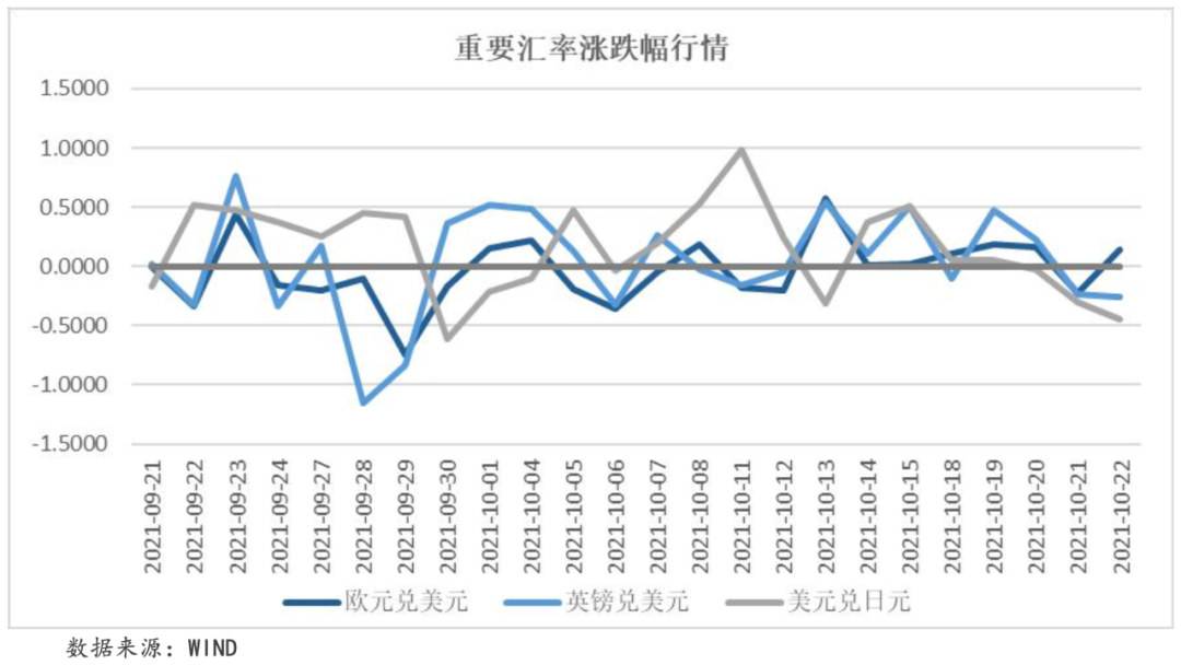 本周,在高通脹壓力以及美元受到打壓的背景下,歐元暫時(shí)保持升勢(shì)。本周歐元兌美元收于1.1642,周內(nèi)累計(jì)收漲0.34%。英國10月綜合PMI數(shù)據(jù)繼續(xù)上行,達(dá)到5月以來的最高位,企業(yè)復(fù)蘇勢(shì)頭強(qiáng)勁,支撐英鎊表現(xiàn)。本周英鎊兌美元收于1.3758,周內(nèi)累計(jì)收漲0.03%。本周,美元兌日元收于113.5000,周內(nèi)累計(jì)收跌0.66%。
