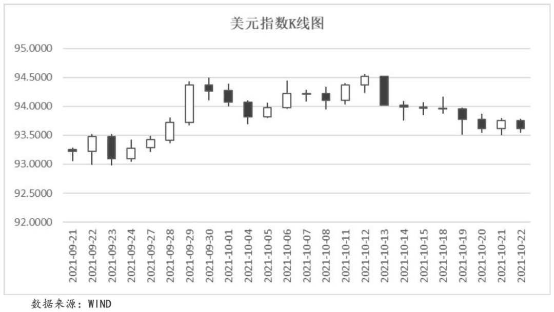 本周,美元指數(shù)出現(xiàn)下跌。一方面,美國“褐皮書”顯示經(jīng)濟(jì)增速已呈現(xiàn)放緩的狀態(tài),打壓美元走勢(shì);另一方面,隨著美國PMI制造業(yè)數(shù)據(jù)的釋出顯示美國勞動(dòng)力和供應(yīng)鏈的問題仍將繼續(xù)限制制造業(yè)的恢復(fù),市場(chǎng)對(duì)美國經(jīng)濟(jì)的復(fù)蘇預(yù)期受到打壓。截至本周五,美元指數(shù)收于93.6116,周內(nèi)累計(jì)收跌0.38%。