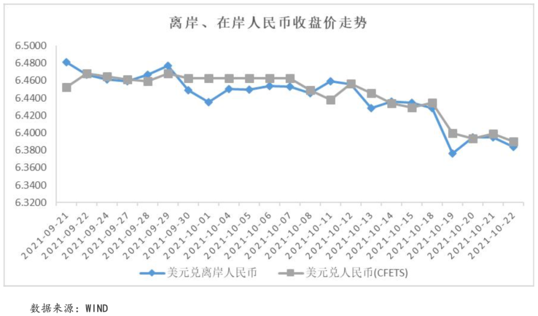 本周,中國三季度GDP增幅同比達(dá)4.9%,經(jīng)濟(jì)復(fù)蘇持續(xù)穩(wěn)定向好;而美國通脹問題持續(xù),經(jīng)濟(jì)恢復(fù)不確定性增加。因此,在岸和離岸人民幣匯率均呈現(xiàn)波動(dòng)走強(qiáng)態(tài)勢(shì)。截至周五,美元兌離岸人民幣匯率收于6.3839,周內(nèi)小幅下跌0.79%;美元兌在岸人民幣匯率收于6.3903,周內(nèi)累計(jì)收跌0.66%。