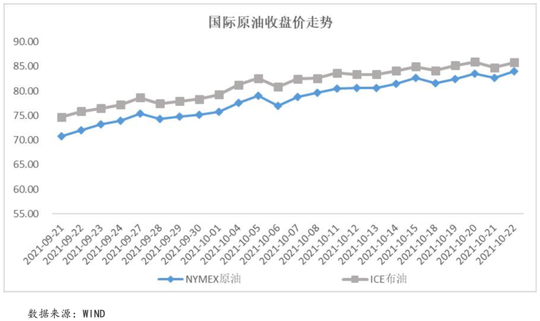 本周,國際油價(jià)繼續(xù)周內(nèi)全面上漲。一是隨著全球經(jīng)濟(jì)復(fù)蘇步伐的加快,石油需求顯著上升,如10月美國和歐元區(qū)PMI制造業(yè)和服務(wù)業(yè)活動(dòng)指數(shù)仍然高于50,經(jīng)濟(jì)活動(dòng)仍在擴(kuò)張;二是隨著亞洲市場(chǎng)對(duì)石油需求的上升(韓國11月原油購買量創(chuàng)下歷史最高水平),當(dāng)下的石油供給結(jié)構(gòu)將進(jìn)一步緊張。三是各國能源儲(chǔ)備逐漸下降的基礎(chǔ)上,OPEC+仍保持原計(jì)劃產(chǎn)出,供應(yīng)趨緊。總體來看,在供應(yīng)不足的條件下,強(qiáng)勁的需求拉動(dòng)石油價(jià)格上揚(yáng)。截至本周五收盤,NYMEX原油價(jià)格收于83.98美元/桶,周內(nèi)累計(jì)收漲2.41%;ICE布油價(jià)格收于85.77美元/桶,周內(nèi)累計(jì)收漲0.97%。