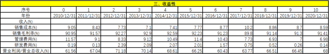 從競爭優勢上看,自由現金流/銷售收入在過去11年中有1年為負,剩余10年都遠遠大于5%,經營績效異常穩健。毛利率基本不變,維持在90%以上,說明對上下游都有極強的把控力。在毛利率不變的情況下,凈利率穩步提升。資產周轉率基本保持不變,說明企業雖然在變大,但經營效率持續穩定。資產收益率和凈資產收益率穩步提升,財務杠桿略有下降。從這些指標可以看出,該企業的競爭優勢非常明顯。