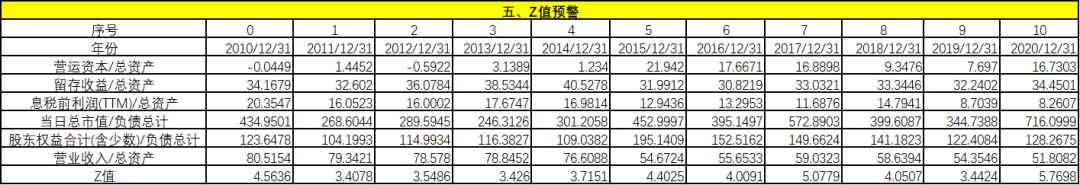 從上面的Z值可以看出,該企業的Z值非常高,遠遠超過了2.675,財務狀況良好,發生破產的概率非常小。