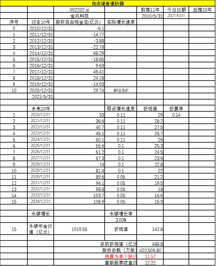 雖然金風科技名氣非常大,但我們不得不正視現實。自由現金流估值模型給出的總估值為488.82億元,換算成個股,股價為11.57元,接近于2021年5月31日12.22元的收盤價。