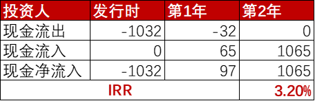 現(xiàn)金流出前置,使得投資人獲得的IRR是要低于用標(biāo)的債券的票面利率-憑證設(shè)立價格的,投資人的現(xiàn)金流入下圖所示,最終算的的IRR是3.2%,要低于前面計算的3.3%。