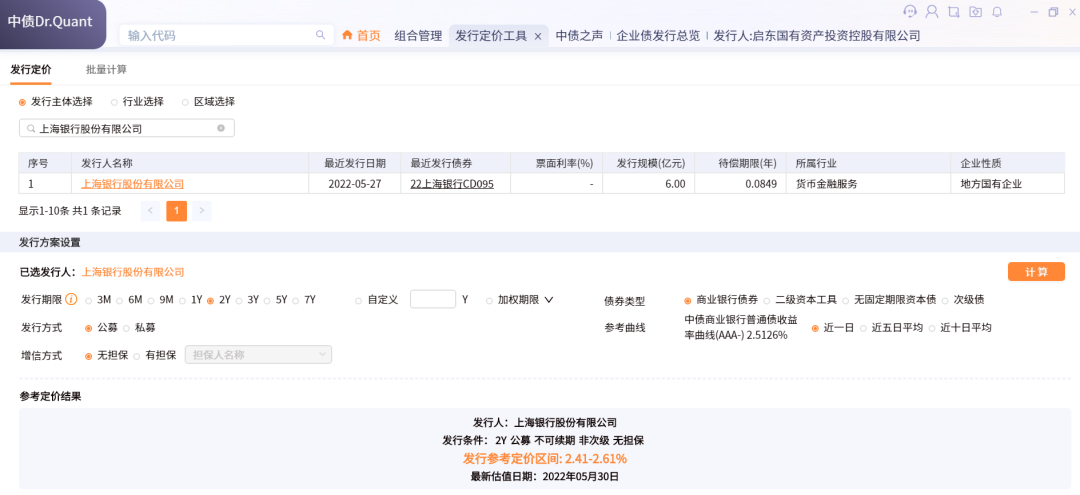 根據(jù)中債Dr Quant的計算結(jié)果,上海銀行發(fā)行2年期同期限債券的票面利率區(qū)間只有2.41%~2.61%,遠(yuǎn)不如買新城控股的債+上海銀行設(shè)立的CRMW,如果我是個理性投資人,肯定是選擇后者。
