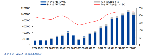 美國(guó)是全球最早發(fā)展REITs的國(guó)家,1960年美國(guó)《國(guó)內(nèi)稅收法案》和《房地產(chǎn)投資信托法案》明確了REITs的稅收結(jié)構(gòu)與法律框架,1965年,首只REITs于紐交所上市,標(biāo)志著REITs市場(chǎng)的啟動(dòng)。隨著政府允許滿(mǎn)足條件的REITs免征所得稅和資本利得,REITs得到快速的發(fā)展,如今美國(guó)的REITs市場(chǎng)已經(jīng)發(fā)展的很成熟了,這種成熟不僅體現(xiàn)在產(chǎn)品的設(shè)計(jì)、操作流程和信息披露,也體現(xiàn)在與REITs市場(chǎng)相對(duì)應(yīng)的法律框架的完備上。目前已經(jīng)超過(guò)30個(gè)國(guó)家引進(jìn)REITs制度并形成交易市場(chǎng)。截至3月末,美國(guó)上市REITs共225只,市值合計(jì)1.216萬(wàn)億美元。