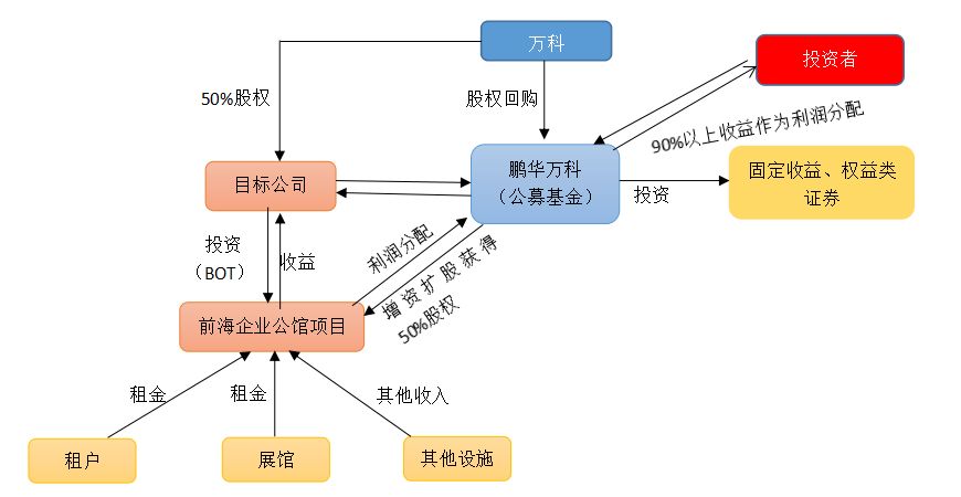 在一定意義上,前海萬(wàn)科REITs是首只公募REITs的嘗試。上市首日,基金交投活躍,成交額超過(guò)5000萬(wàn)元。發(fā)行期間單個(gè)投資者的單筆認(rèn)購(gòu)門(mén)檻為10萬(wàn)元。產(chǎn)品成立并上市后,在二級(jí)市場(chǎng)1萬(wàn)元即可參與交易。其標(biāo)的資產(chǎn)主要是萬(wàn)科前海企業(yè)公館未來(lái)8年的租金收益權(quán)。投資分為兩部分,其一是投資于目標(biāo)公司,比例不超過(guò)基金資產(chǎn)的50%;另一部分將投資于固定收益類(lèi)資產(chǎn)、權(quán)益類(lèi)資產(chǎn)等,比例不低于基金資產(chǎn)的50%。其中,對(duì)于目標(biāo)公司的投資是通過(guò)增資方式持有目標(biāo)公司50%的股權(quán)至2023年7月24日,由此獲取自2015年1月1日起至2023年7月24日期間前海企業(yè)公館項(xiàng)目100%的租金收益權(quán)。