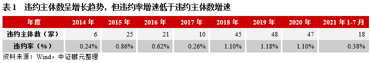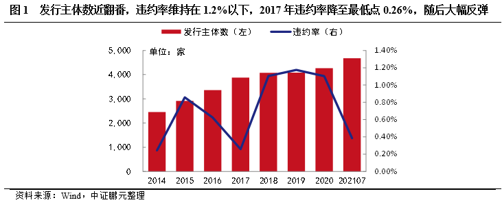 2014-2021年(2021年數(shù)據(jù)截至7月底,下同),我國(guó)信用債券違約主體數(shù)不斷增長(zhǎng),2019年為違約高峰,首次違約的主體數(shù)達(dá)到48家(表1)。隨著違約主體數(shù)增加,違約率也有所上升,但由于我國(guó)信用債券市場(chǎng)擴(kuò)容、發(fā)債主體數(shù)大幅增長(zhǎng)(圖1),違約率增長(zhǎng)速度低于違約主體數(shù)的增長(zhǎng)速度,近三年基本維持在1.1%上下。在2017年時(shí),違約數(shù)量大幅下降,違約率下降至2014年后的歷史低點(diǎn)0.26%(表1和圖1),隨后違約數(shù)量大幅增加,違約率開始反彈,并創(chuàng)新高隨后維持較高水平。2021年由于時(shí)間跨度只有7個(gè)月,違約數(shù)量較少,導(dǎo)致違約率較低。