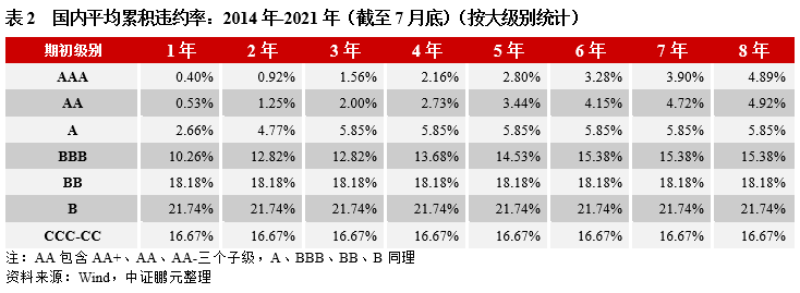 依照上述處理方法,我們按大級(jí)別和小級(jí)別兩類分別統(tǒng)計(jì)了2014-2021年的平均累積違約率,大級(jí)別違約率用于觀察違約率從高級(jí)別到低級(jí)別的整體分布概況,小級(jí)別違約率用于觀察子級(jí)別間的違約率差異。并對(duì)比穆迪全球的平均累積違約率數(shù)據(jù),從而觀察出我國(guó)的違約率特征(注:我國(guó)數(shù)據(jù)和穆迪全球數(shù)據(jù)的統(tǒng)計(jì)年度不完全重疊,兩者經(jīng)歷的經(jīng)濟(jì)周期不同,會(huì)對(duì)違約率產(chǎn)生一定的影響,本文假設(shè)這種影響較小,暫且忽略該因素對(duì)最終違約率的影響)。