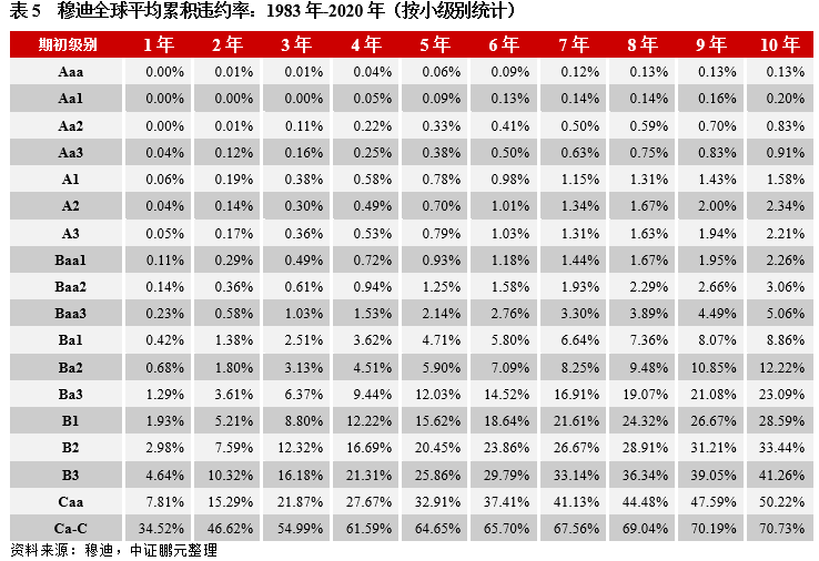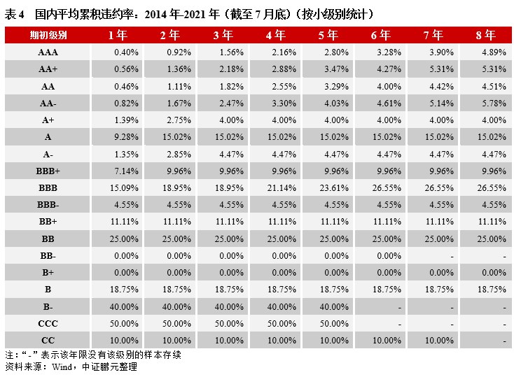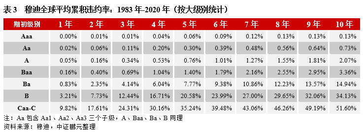 2.相較于穆迪全球,我國(guó)高級(jí)別違約率偏高,低級(jí)別違約率偏低,呈“平坦”化分布。AAA的各年限違約率較穆迪均偏高,且第一年就有違約,而穆迪在第二年后才出現(xiàn)違約;低評(píng)級(jí)方面,例如:國(guó)內(nèi)B級(jí)8年期平均累積違約率為21.74%,低于穆迪的29.65%。這說明相較于穆迪的國(guó)際評(píng)級(jí)序列來說,我國(guó)部分高評(píng)級(jí)主體的級(jí)別是虛高的,其實(shí)際信用風(fēng)險(xiǎn)高于其評(píng)定級(jí)別的信用風(fēng)險(xiǎn)定義,應(yīng)降低這部分主體的評(píng)級(jí)級(jí)別,從而使高級(jí)別違約率回歸至合理水平。而低級(jí)別違約率偏低,一是因?yàn)闃颖静蛔?,統(tǒng)計(jì)結(jié)果的統(tǒng)計(jì)意義不強(qiáng);二是跟早年我國(guó)信用債券市場(chǎng)的“剛兌”思想有關(guān),部分低評(píng)級(jí)主體在各方協(xié)調(diào)下最終兌付,使得低評(píng)級(jí)違約率較全球水平來說偏低;另外,當(dāng)虛高級(jí)別主體的評(píng)級(jí)下調(diào)后,一定程度上也會(huì)提升低評(píng)級(jí)違約率。
