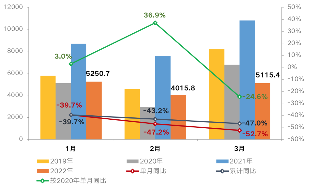 3月單月業(yè)績表現(xiàn)也印證了房地產(chǎn)行業(yè)持續(xù)的下行壓力。百強房企單月銷售操盤金額僅5115.4億元,環(huán)比雖增長27.4%,但增幅明顯低于往年同期。百強房企銷售業(yè)績同比降幅達到52.7%,較1、2兩月進一步擴大,其中較2月降幅擴大5.5個百分點;相比1月業(yè)績規(guī)模降低2.6%。