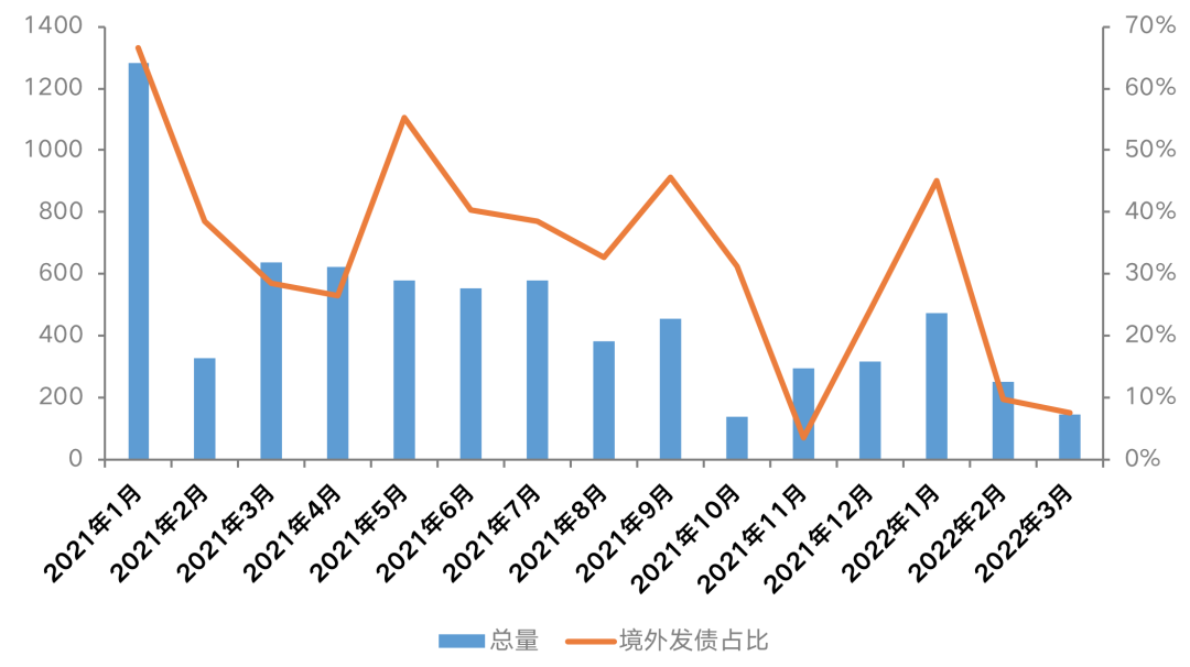 圖:2021年至2022年3月房企發(fā)債總量及境外債占比(億元)