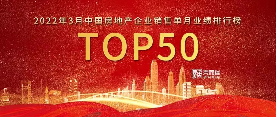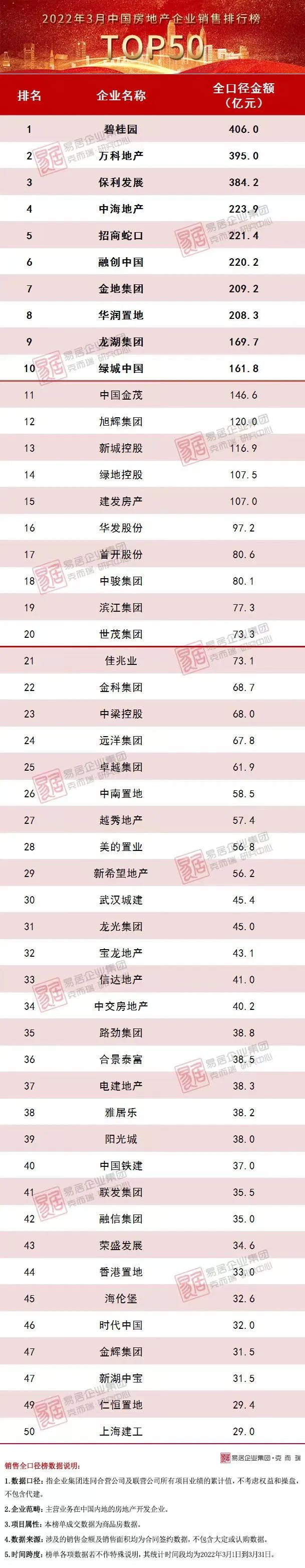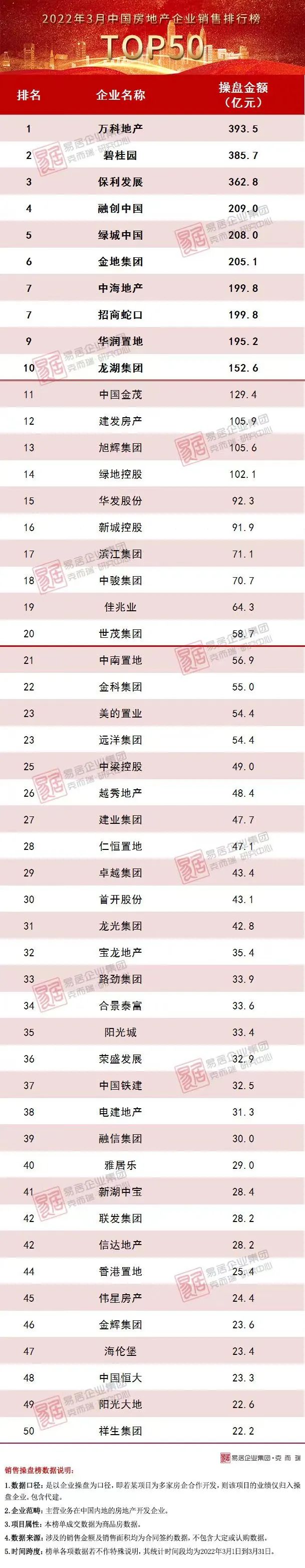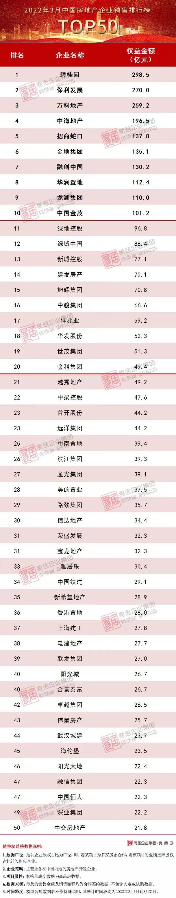 附:2022年3月中國房地產(chǎn)企業(yè)銷售排行榜TOP50