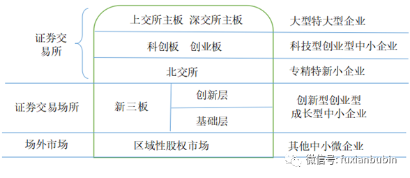 從企業(yè)數(shù)量和規(guī)模上來(lái)區(qū)分,常用金字塔來(lái)形容我國(guó)多層次資本市場(chǎng)結(jié)構(gòu):區(qū)域性股權(quán)市場(chǎng)為塔基,區(qū)域性市場(chǎng)、場(chǎng)外市場(chǎng),但其擁有和服務(wù)著最海量的中小微企業(yè);新三板為塔中,全國(guó)性證券交易場(chǎng)所、場(chǎng)內(nèi)市場(chǎng),服務(wù)廣大的創(chuàng)新型創(chuàng)業(yè)型成長(zhǎng)型中小企業(yè),承擔(dān)承上啟下的重任;京滬深三交易所為塔尖,服務(wù)企業(yè)相對(duì)較少,但企業(yè)相對(duì)已很成熟。如果根據(jù)市場(chǎng)的重要性來(lái)看,又是一個(gè)倒金字塔結(jié)構(gòu),塔尖對(duì)我國(guó)經(jīng)濟(jì)的重要性最大。