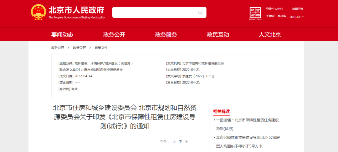 4月21日,北京市住房和城鄉建設委員會、北京市規劃和自然資源委員會發布《北京市保障性租賃住房建設導則(試行)》(以下簡稱《導則》)。從整體規劃、配套設施、單體設計、室內裝修、應用技術等方面,對北京的保障性租賃住房的提出了具體的標準和要求,能夠有效地指導未來北京市保障性租賃住房的建設和發展。該政策的出臺標志著北京保障性租賃住房的樣貌和功能已基本確定。