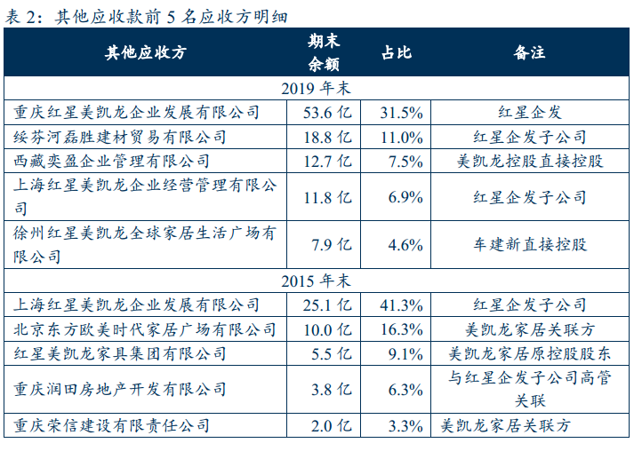 而2015年的前5名名應收方中,除了上海紅星美凱龍企業經營管理有限公司為紅星企發子公司,重慶潤田房地產開發有限公司的為紅星企發關聯方,其他三家公司都屬于美凱龍家居關聯公司。