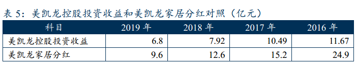 公司未分配利潤主要來源于投資收益,除了2019年自身經營業務虧損3億元以外,其他年度營業收入基本能覆蓋利息費用,凈利潤主要來源于投資收益。2016年至2019年,公司分別獲得投資收益11.7億元、10.5億元、7.9億元、6.5億元,沒有披露相關明細,但是通過與美凱龍家居歷年的現金分紅情況相較,按70%左右持股比例,可知除2016年以外,每年的投資收益基本都與美凱龍家居的分紅相匹配。但這些年中僅2019年對美凱龍家居增加投資1億元,則總體來看從美凱龍家居方凈獲取資金達40億元左右。此外,其他應收款方面也在逐步收回對美凱龍家居的拆借,考慮上這個部分未來從美凱龍家居會逐步有些回收。