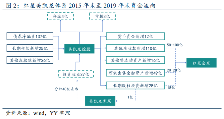 因此簡單來看,從2016年至2019年,母公司在資本市場發行債券凈融資137億元(不含出表ABS,含可交債),新增長期借款25億元,新增其他應付款26億元,投資收益37(其中獲得美凱龍家居分紅40億左右),對應資產來看,則是形成貨幣資金12億元,其他應收款110億元(紅星企發占比50%以上),可供出售金融資產49億,長期股權投資28億(其中紅星企發18億,美凱龍家居1億),其他非流動資產16億,此外,自身經營業務還虧損掉了3億左右,分紅在4億左右。