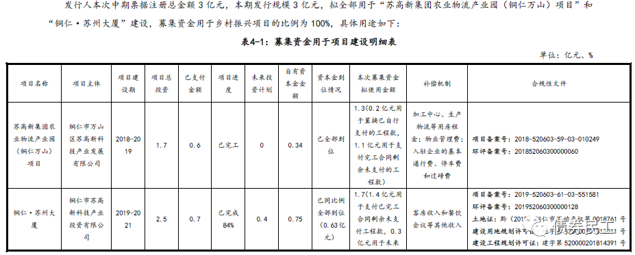 根據(jù)募集說明書披露的信息,本次中期票據(jù)的用途為用于“蘇高新集團(tuán)農(nóng)業(yè)物流產(chǎn)業(yè)園(銅仁萬山)項(xiàng)目”和“銅仁·蘇州大廈”建設(shè)。募投項(xiàng)目項(xiàng)目均位于貴州省銅仁市武陵山片區(qū)區(qū)域發(fā)展與扶貧攻堅示范區(qū),全部用于支付與鄉(xiāng)村振興相關(guān)的鞏固拓展扶貧攻堅成果項(xiàng)目的剩余工程款項(xiàng)。