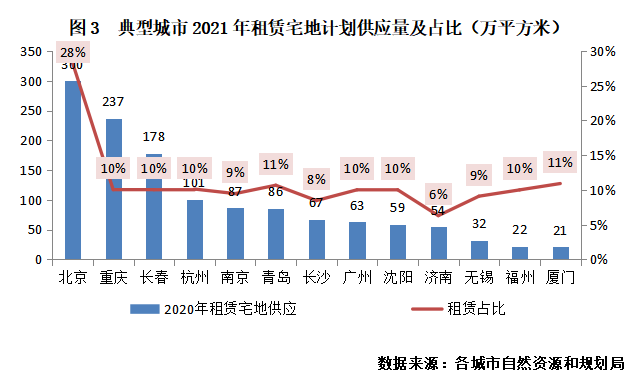 就已經(jīng)發(fā)布2021年供地計(jì)劃的城市來(lái)看,北京表現(xiàn)最為突出。2021年北京市土地供應(yīng)計(jì)劃中明確租賃住房用地供應(yīng)指標(biāo)為300公頃,其占住宅用地的比重由2020年的13%大幅提高到28%,無(wú)論是租賃住房量還是占比均居于首位(截止4月21日,上海尚未公布2021年建設(shè)用地供地計(jì)劃,不過上海政府工作報(bào)告中提到,2021年將形成5.3萬(wàn)套的租賃住房供應(yīng),供地力度也比較大)。