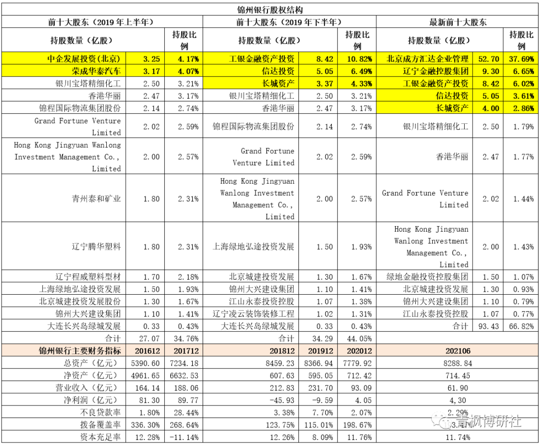 1、和包商銀行另起爐灶不同的是,錦州銀行則是通過(guò)債務(wù)重組來(lái)完成化險(xiǎn)改革。2019年,錦州銀行因年報(bào)延遲披露等原因而暴露風(fēng)險(xiǎn),在監(jiān)管部門(mén)的指導(dǎo)下進(jìn)行改革重組,引入工銀投資、信達(dá)投資、長(zhǎng)城資產(chǎn)等戰(zhàn)略投資者(持有3.25億股的中企發(fā)展投資(北京)與持有3.17億股的榮成華泰汽車前兩大股東退出),并轉(zhuǎn)讓部分內(nèi)資股、剝離風(fēng)險(xiǎn)資產(chǎn)、實(shí)施增資擴(kuò)股。