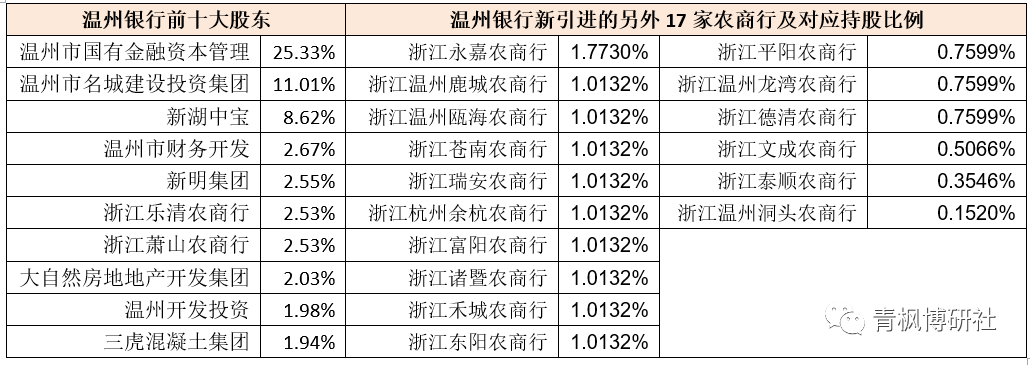 2、此次增資擴(kuò)股新引進(jìn)的19家農(nóng)商行有2家進(jìn)入溫州銀行前十大股東序列,即浙江樂(lè)清農(nóng)商行與浙江蕭山農(nóng)商行,持股比例均2.53%。不過(guò)盡管如此,溫州銀行的第一股東依然為溫州市國(guó)有金融資本管理(持股25.33%),溫州銀行原來(lái)的第一大股東新湖中寶退至第三(持股比例18.15%降至8.62%)。