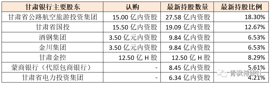 經(jīng)過(guò)此次改革重組后,甘肅省公路航空旅游投資集團(tuán)、甘肅省國(guó)投、酒鋼集團(tuán)、金川集團(tuán)、甘肅金控以及甘肅省電力投資集團(tuán)合計(jì)持有甘肅銀行的股權(quán)比例達(dá)到56.53%,蒙商銀行的持股比例則由之前的8.39%降至目前的5.61%、由第二大股東降至第六大股東。