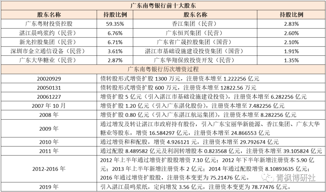 (三)廣東南粵銀行:原三家股東陷危機(jī),引進(jìn)第一大股東粵財(cái)投資控股                                                         1、2021年12月27日,廣東銀保監(jiān)局核準(zhǔn)了南粵銀行的增資擴(kuò)股方案(增發(fā)115億股股份);同年12月31日,廣東銀保監(jiān)局同意南粵銀行注冊(cè)資本金由78.77476009億元增至193.77476009億元(即新增115億元)。此次增發(fā)的115億股股份,全部由廣東粵財(cái)投資控股認(rèn)購(gòu),認(rèn)購(gòu)后廣東粵財(cái)投資控股持有廣東南粵銀行總股本的59.35%,成為后者第一大股東。