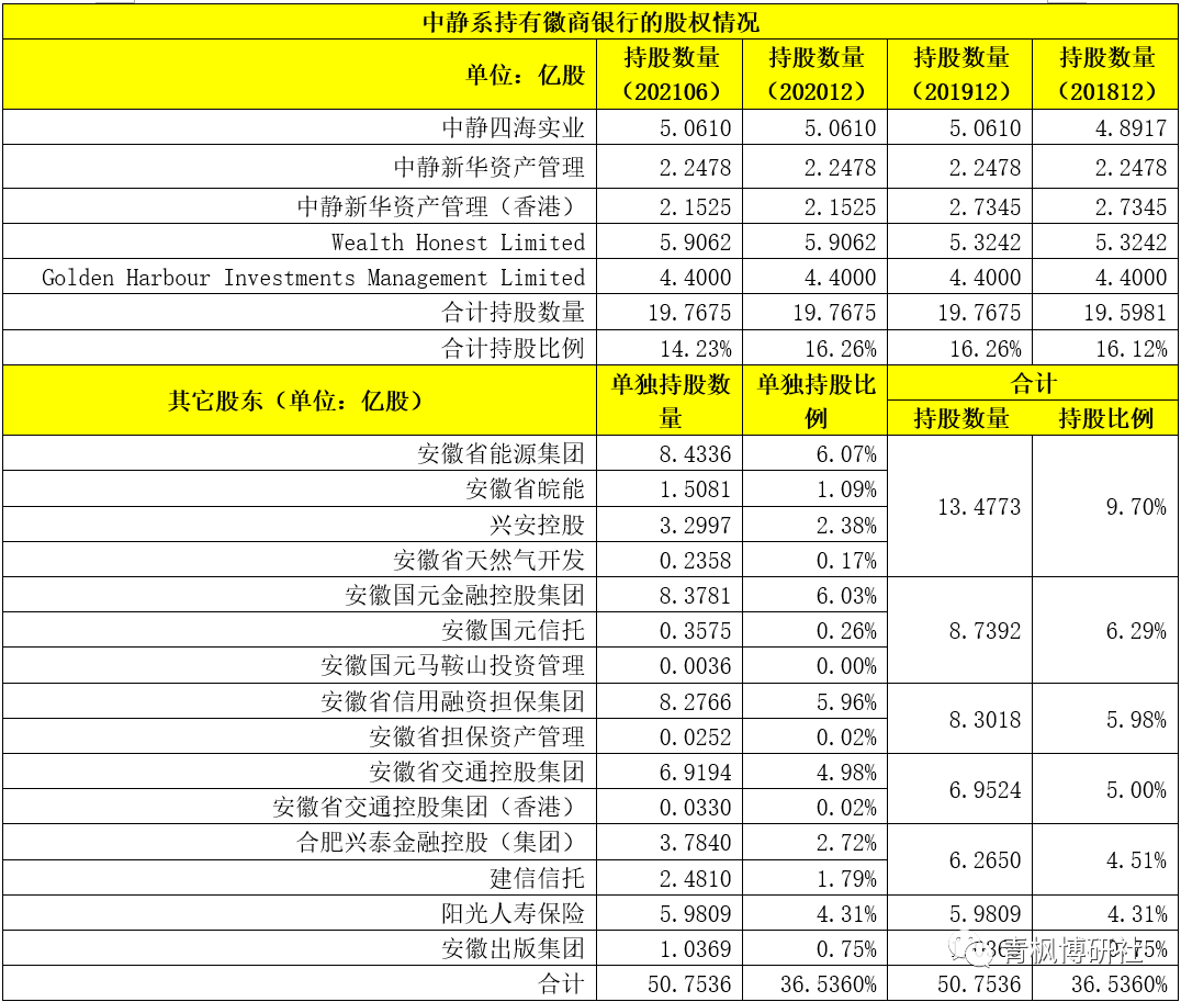 2、中靜系主要通過(guò)旗下中靜新華資產(chǎn)管理、中靜新華資產(chǎn)管理(香港)、中靜四海實(shí)業(yè)以及Wealth Honest Limited、Golden Harbor Investments Management Limited等主體持有徽商銀行股份。截至2021年6月,中靜系合計(jì)持有徽商銀行19.7675億股股份,持股比例達(dá)到14.23%,為徽商銀行第一大股東。