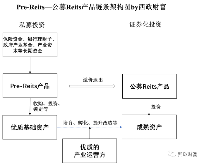 在上述架構(gòu)中,Pre-Reits聯(lián)合諸如保險(xiǎn)資金、銀行理財(cái)子資金、政府產(chǎn)業(yè)投資基金、產(chǎn)業(yè)資本等長(zhǎng)期資金共同成立Pre-Reits私募股權(quán)投資基金,在一級(jí)市場(chǎng)提前鎖定優(yōu)質(zhì)資產(chǎn)(產(chǎn)業(yè)運(yùn)營(yíng)方若有優(yōu)質(zhì)的基礎(chǔ)資產(chǎn),亦可納入相關(guān)的資產(chǎn)池),資金用于優(yōu)質(zhì)項(xiàng)目的新建或存量?jī)?yōu)質(zhì)項(xiàng)目的收購(gòu),并綁定產(chǎn)業(yè)運(yùn)營(yíng)方深度合作。產(chǎn)業(yè)運(yùn)營(yíng)方通過(guò)將基礎(chǔ)資產(chǎn)培育、孵化、提升改造成為成熟資產(chǎn),在資產(chǎn)達(dá)到發(fā)行標(biāo)準(zhǔn)后,將項(xiàng)目資產(chǎn)打包為資產(chǎn)支持專項(xiàng)計(jì)劃并出售給Reits,并獲取一級(jí)市場(chǎng)股權(quán)投資及二級(jí)資本市場(chǎng)溢價(jià)退出的高額投資回報(bào)。