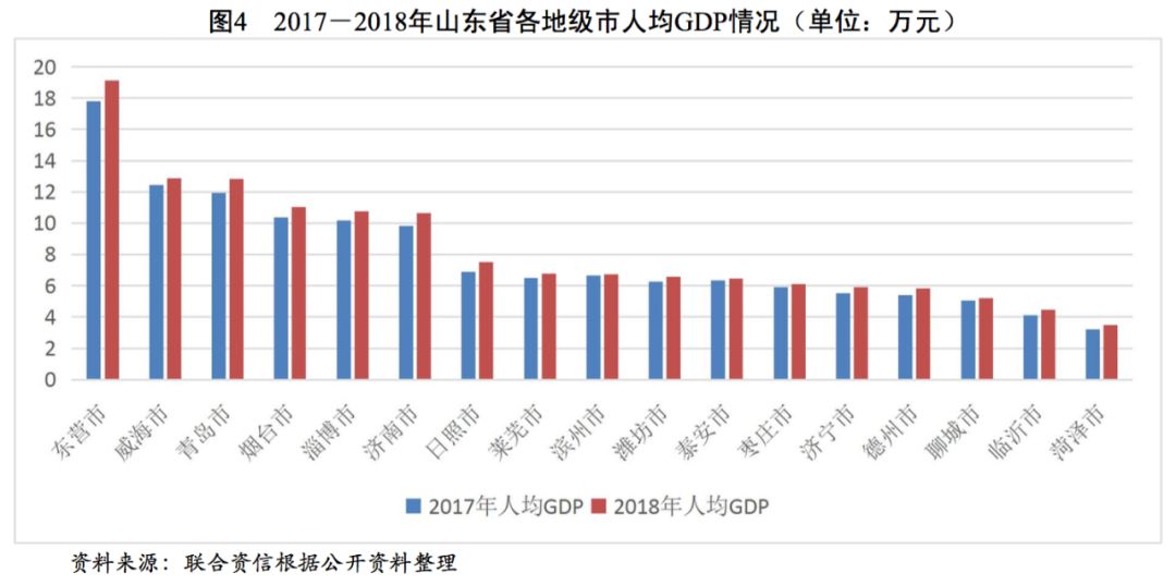 山東省經濟規模處于全國上游水平,2018年GDP排名全國第三,一般公共預算收入排名全國前列,政府債務率處于全國偏低水平,整體債務負擔輕。山東省各地級市經濟實力和財政收入分化較重,東部沿海城市和省會濟南市的經濟規模和財政實力明顯高于其他地級市。山東省各地級市一般公共預算收入質量較好,部分地級市政府債務負擔較重。