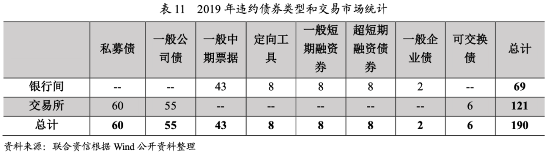 2019年,信用債到期規模高企,進入回售期的信用債規模同比大幅增長,疊加經濟增速換擋及金融去杠桿帶來的信用收縮,弱資質高杠桿企業償債壓力依然很大,債券市場延期2018年態勢,信用風險整體維持在較高水平,交易所和銀行間市場共計73個主體違約,涉及190只債券。