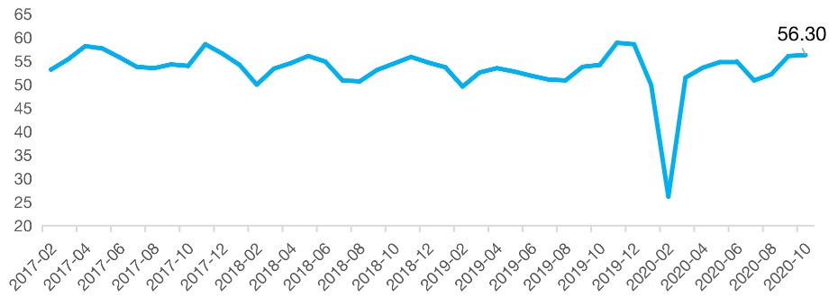 兩只持有中國物流資產(chǎn)的REITs表現(xiàn)更為優(yōu)越,不但一舉收復失地更較年初實現(xiàn)7%漲幅。根據(jù)中國物流與采購聯(lián)合會數(shù)據(jù)顯示,10月份中國物流業(yè)景氣指數(shù)為56.3%,較上月回升0.2個百分點,為今年以來最高。