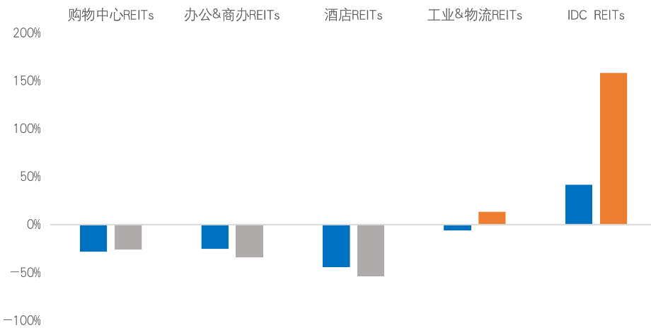 在新加坡市場上市的吉寶IDC REITs作為唯一以數(shù)據(jù)中心為底層資產(chǎn)的REITs今年表現(xiàn)搶眼,頗受市場投資者追捧,較年初已實現(xiàn)超40%漲幅,REITs溢價目前已超150%。而折溢價本身正體現(xiàn)著REITs對于不動產(chǎn)市場的價格發(fā)現(xiàn)功能,除IDC REITs外,恢復情況較好的工業(yè)/物流REITs也實現(xiàn)了折溢價的“由負轉(zhuǎn)正”。