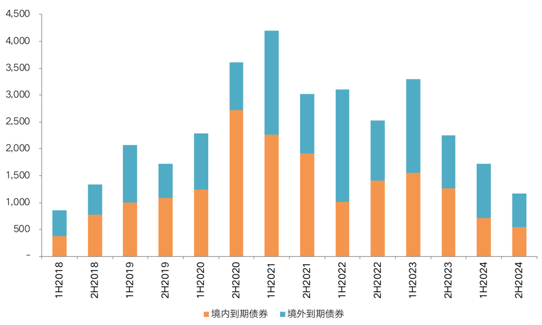另一方面,在2016年年底境內債發(fā)行受限后,房企發(fā)債轉向海外,2017年開啟海外債潮“元年”,2-5年的發(fā)債年限是主力,所以房企近幾年境外的到期量均較大。
