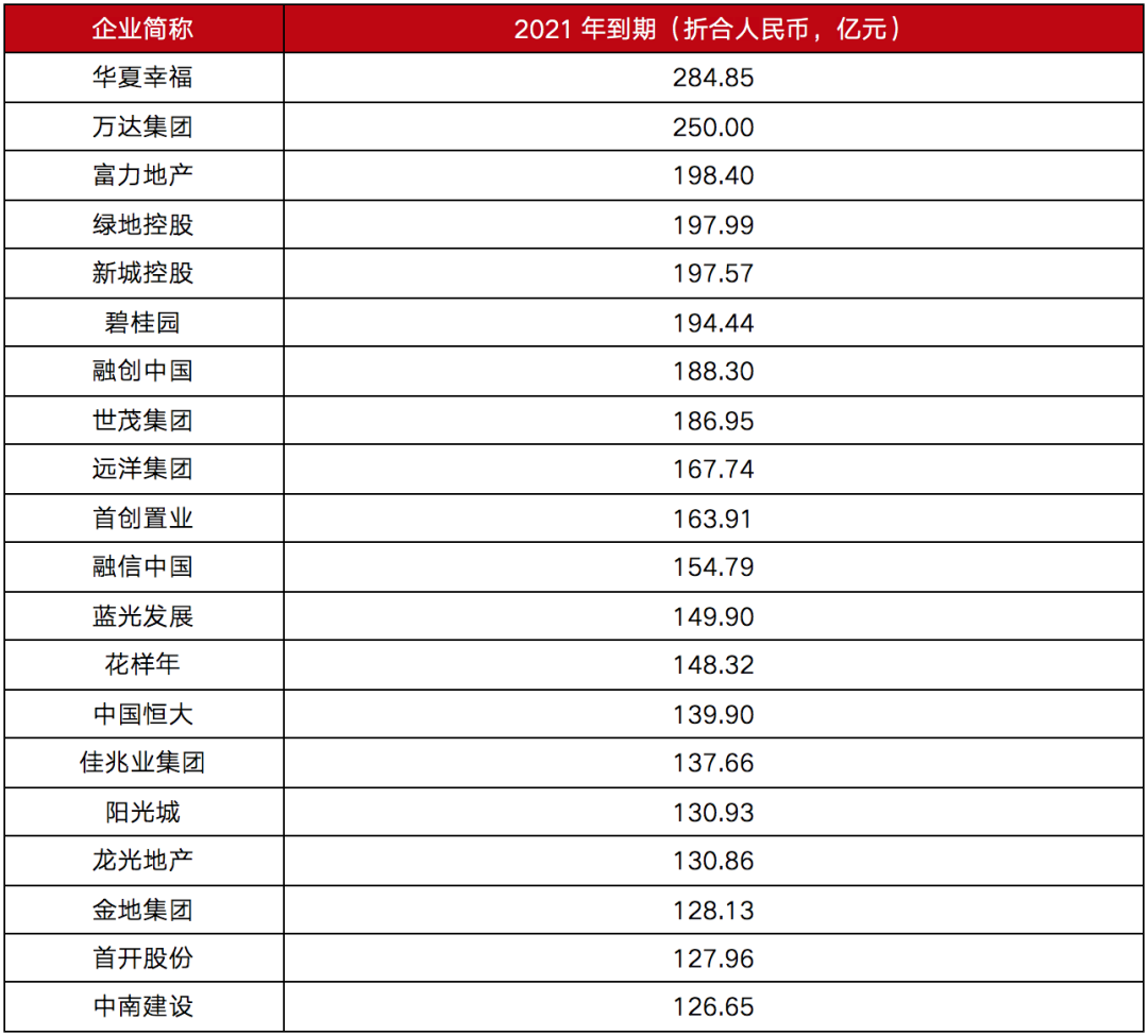 由于目前政策供需兩端限制房企融資,面對2021年的償債高峰,雖部分房企提前償還了共計約460億元的債券,但數(shù)額較小。具體企業(yè)而言,2021年到期債券最高為華夏幸福,需償還284.85億元,其次為萬達集團,兩家企業(yè)均突破二百億元。整體來看,房企償債及經營壓力巨大,未來可能誕生更多的債券違約。