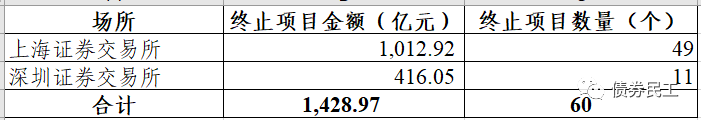 2022年3月終止的債券項(xiàng)目(小公募、私募債和ABS)金額合計(jì)為1,428.97億元,終止項(xiàng)目數(shù)量60個(gè)。其中上海證券交易所終止金額為1,012.92億元,占比為70.88%;深圳證券交易所終止金額為416.05億元,占比為29.12%。