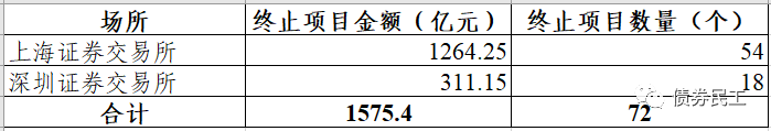 2022年2月終止的債券項(xiàng)目(小公募、私募債和ABS)金額合計(jì)為1575.40億元,終止項(xiàng)目數(shù)量72個(gè)。其中上海證券交易所終止金額為1264.25億元,占比為80.25%;深圳證券交易所終止金額為311.15億元,占比為19.75%。